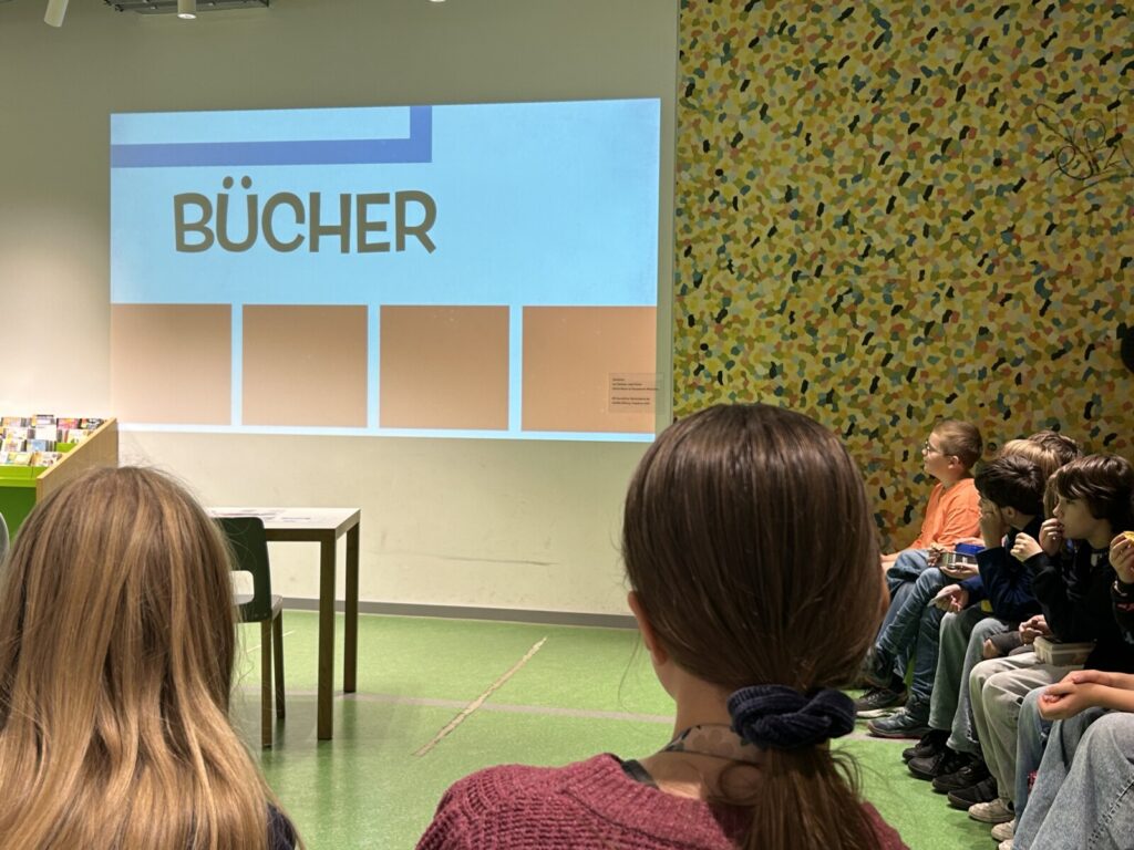 Als wir dort ankamen, begrüßte uns eine Mitarbeiterin der Kinder- und Jugendbibliothek. Sie hielt eine kurze, informative Präsentation. Wir erfuhren, dass verschiedene Bücherarten, z. B. Comics oder Romane, in verschiedene Bücherregale aufgeteilt sind. Außerdem gibt es für die verschiedenen Altersklassen verschiedene Räume.